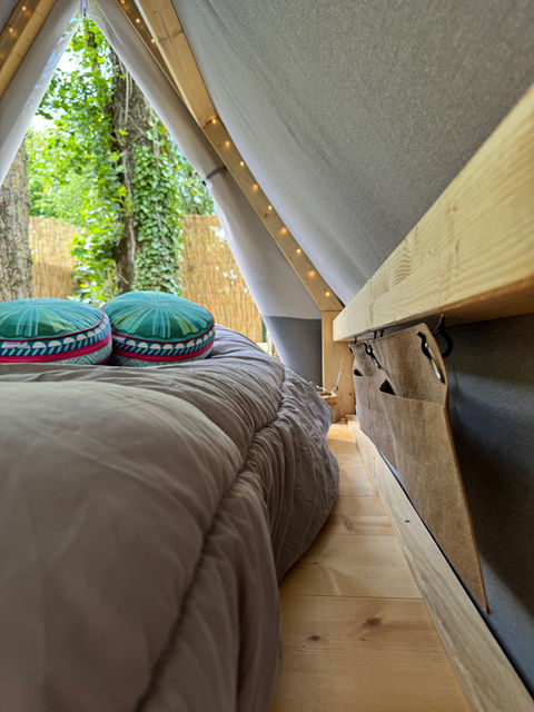 Una tenda glamping di pregevole fattura, costruita con robusti materiali naturali e sollevata da terra, con un letto matrimoniale king size e due uscite di ampio respiro. Si trova in uno spazio recintato e ombreggiato per la massima privacy, con un bagno privato assolutamente suggestivo. Dormire nel tipì è un'esperienza accattivante e moderne per tutte le età.