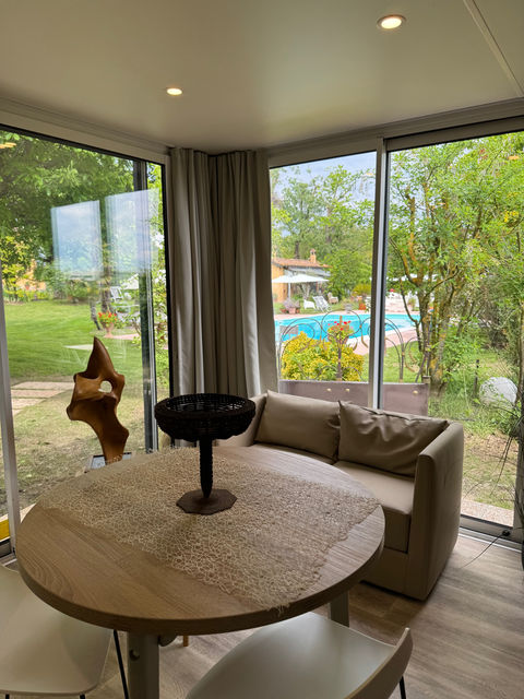 Si tratta di un monolocale immerso nel verde con ampie vetrate che offre la vista del parco, della torre e della vicina piscina. È composto da zona notte con letto matrimoniale, zona giorno con divano a due posti e angolo cucina con piano a induzione, microonde e frigobar. Completo di tutti i comfort tra cui Wi-Fi, smart TV con Netflix, aria condizionata e riscaldamento. Può ospite due persone, più eventualmente un paio di bambini.